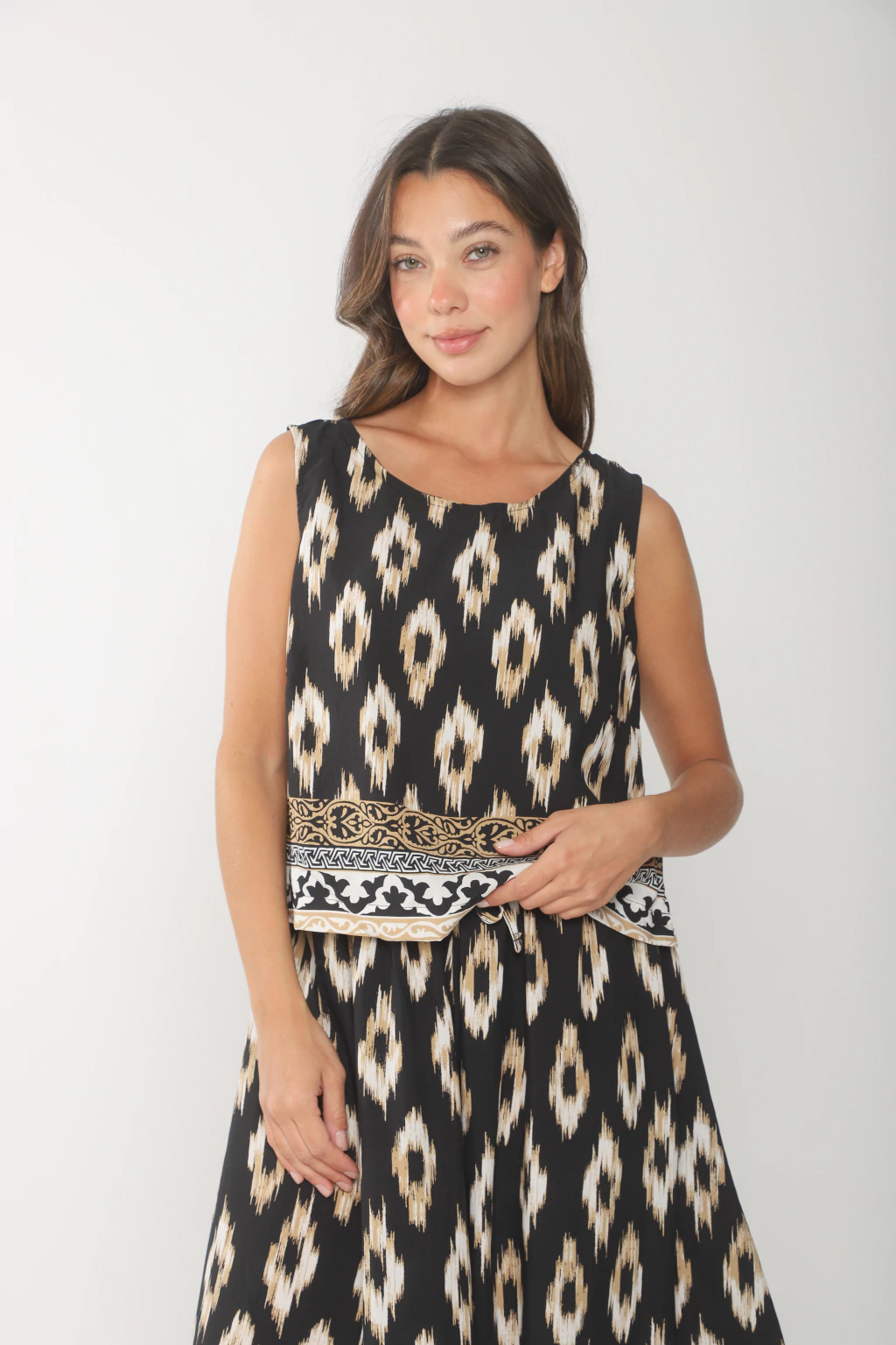 Blusa confeccionada en seda estampada con guarda abajo. Modelo amplio con pinzas