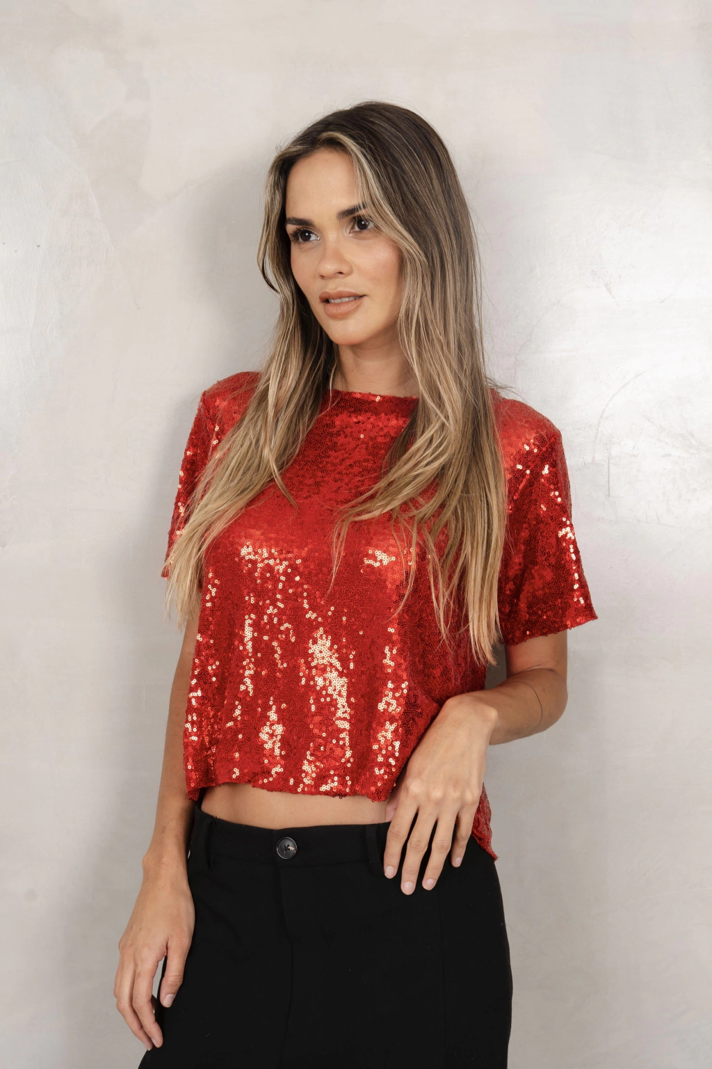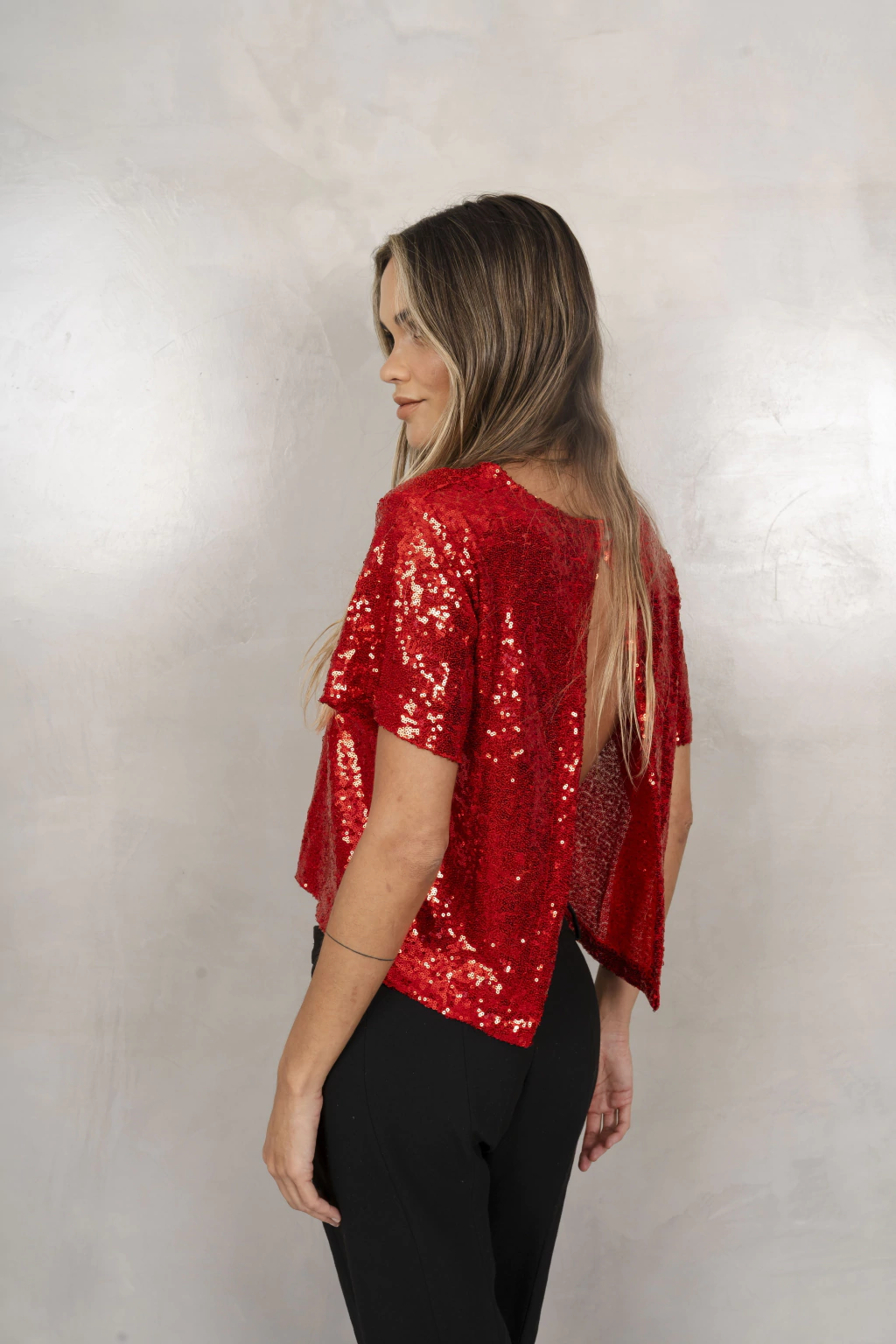 Top confeccionado en Lentejuela, modelo manga corta , espalda abierta con boton en cuello.