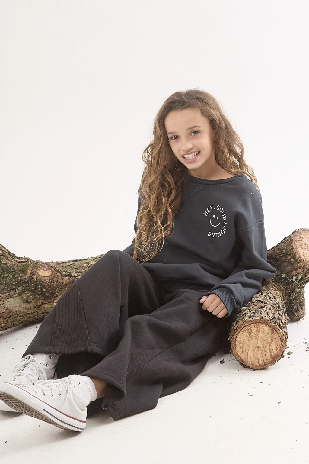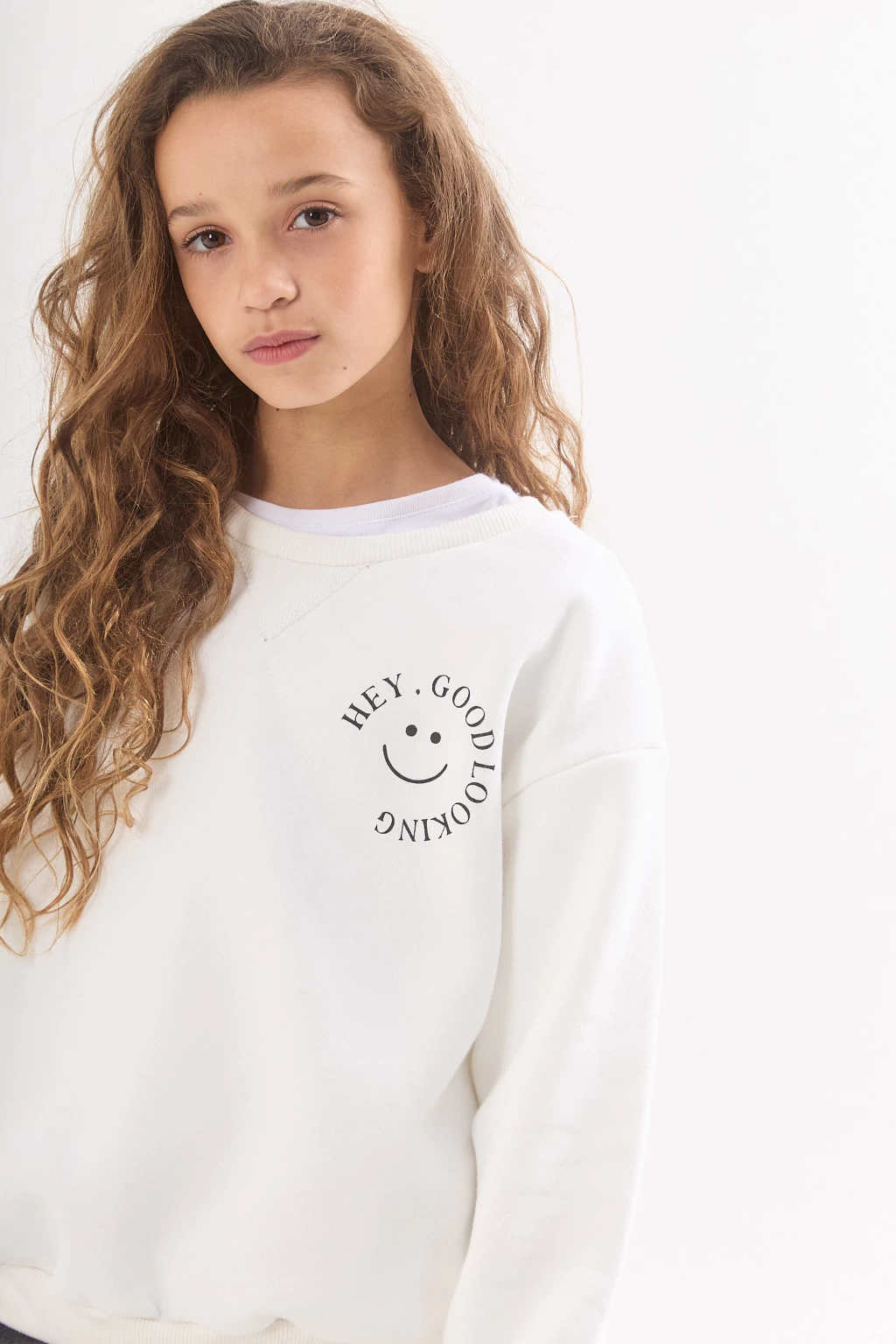 Buzo confeccionado en frisa con reeb en puños. Buzo cuello O con estampa tipo logo a un costado.