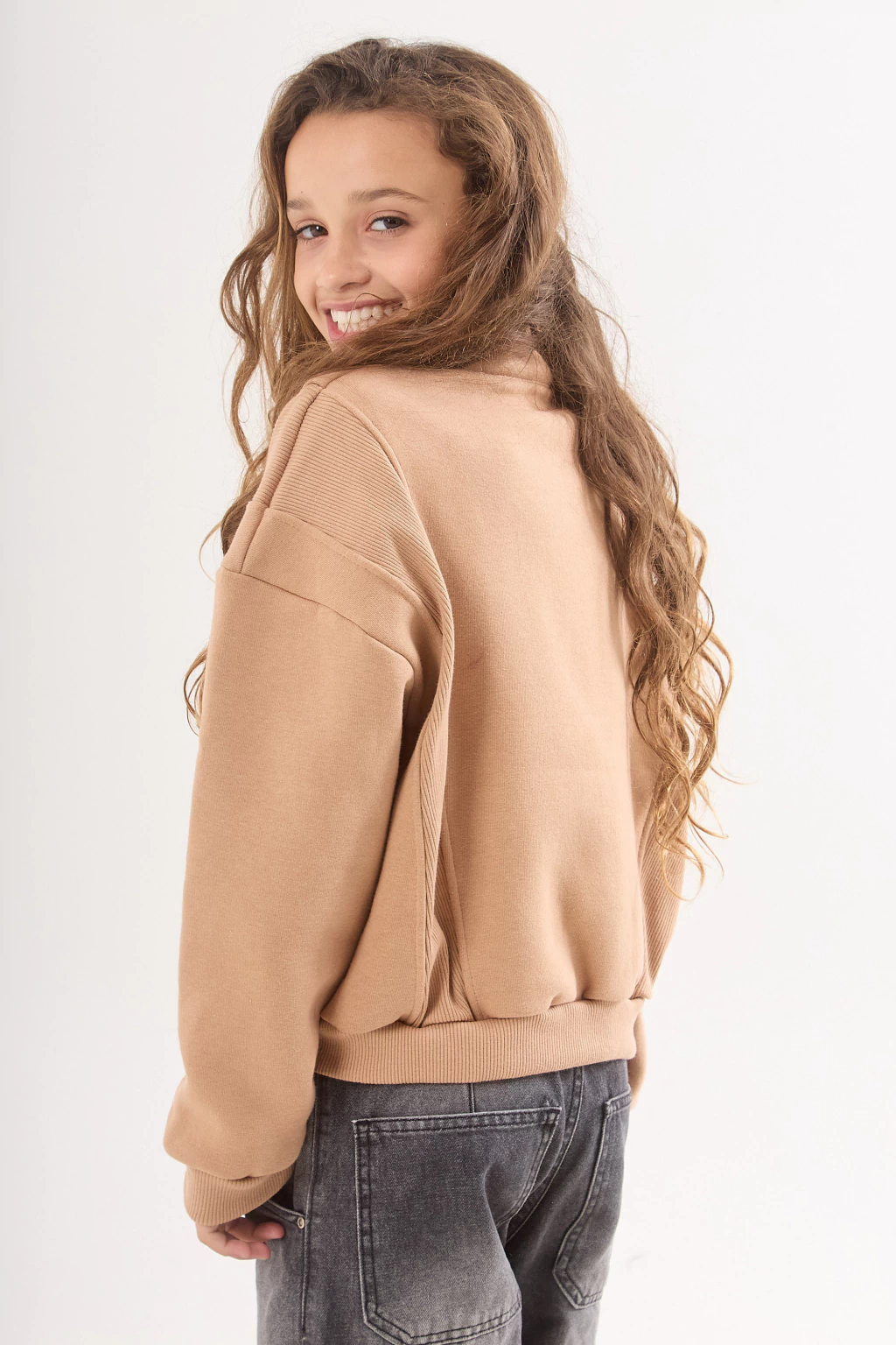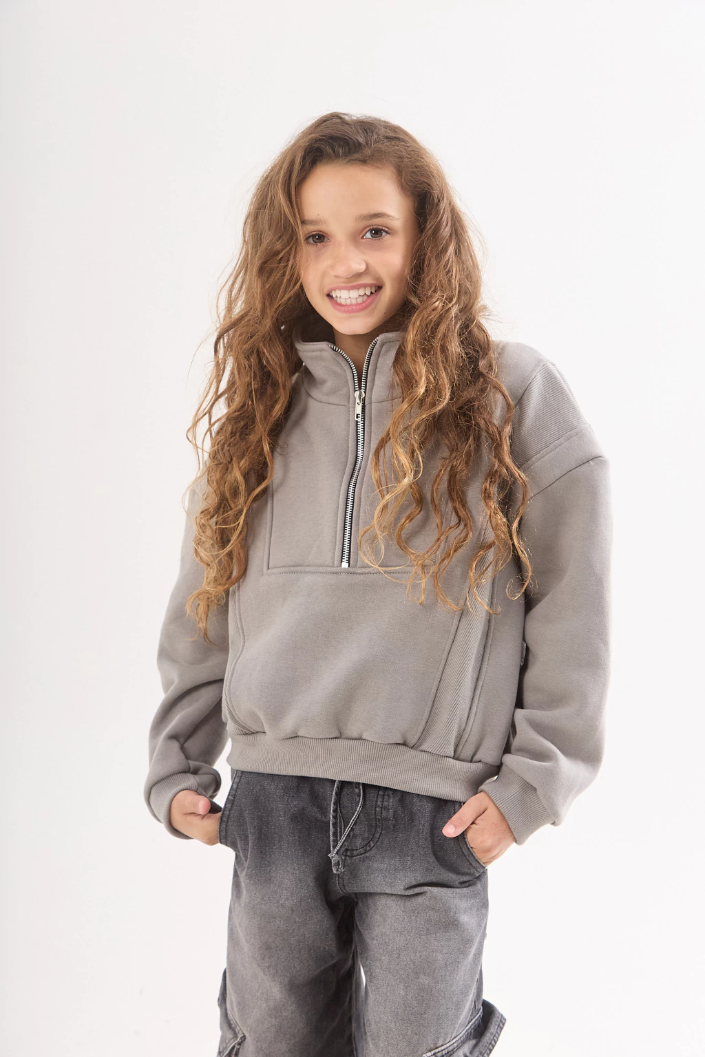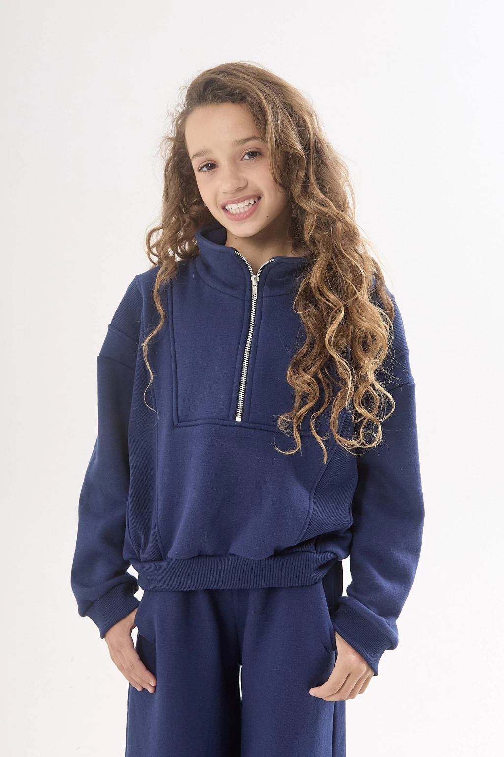 Buzo confeccionado en Frisa con cierre en el cuello y recortes combinados.
