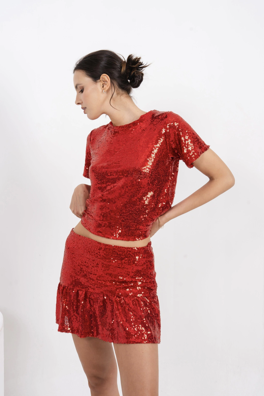 Falda confeccionada en lentejuela, con un volado y cierre invisible de costado.