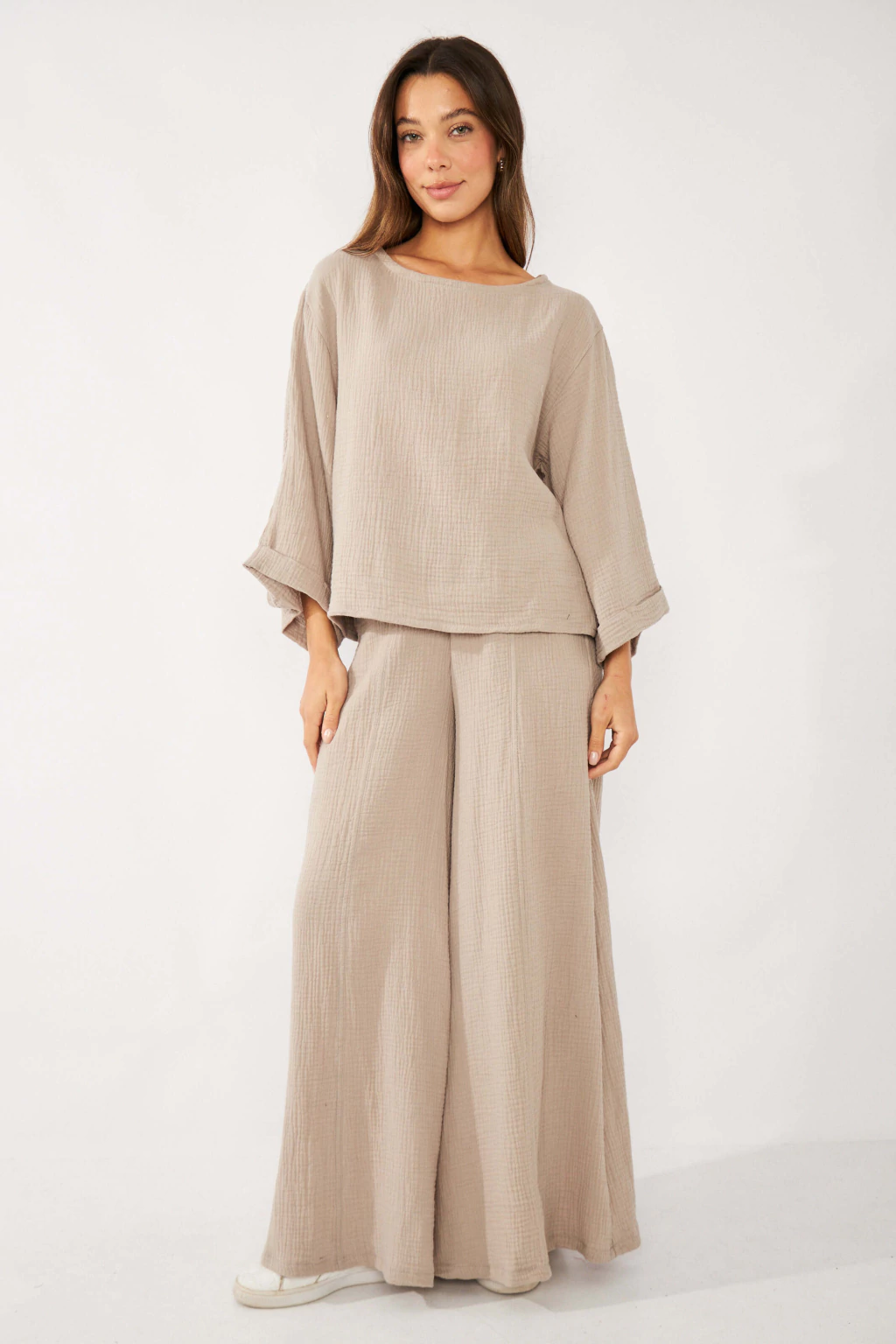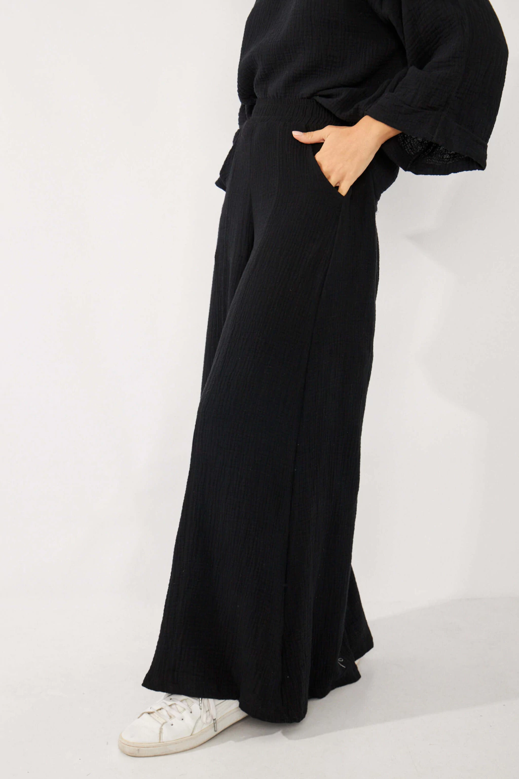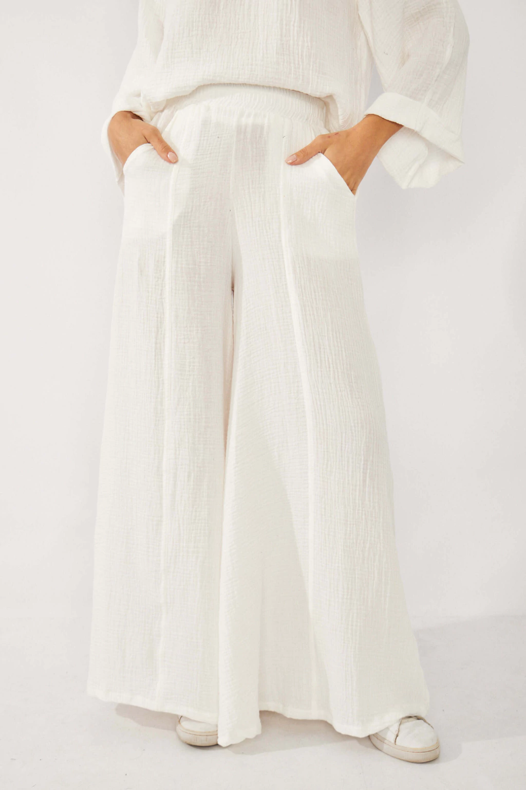 Pantalon confeccionado en baby cotton, modelo ancho con recorte y cintura con elastico