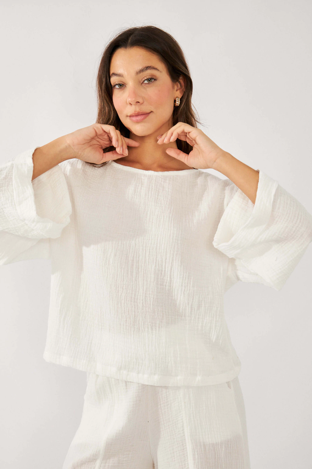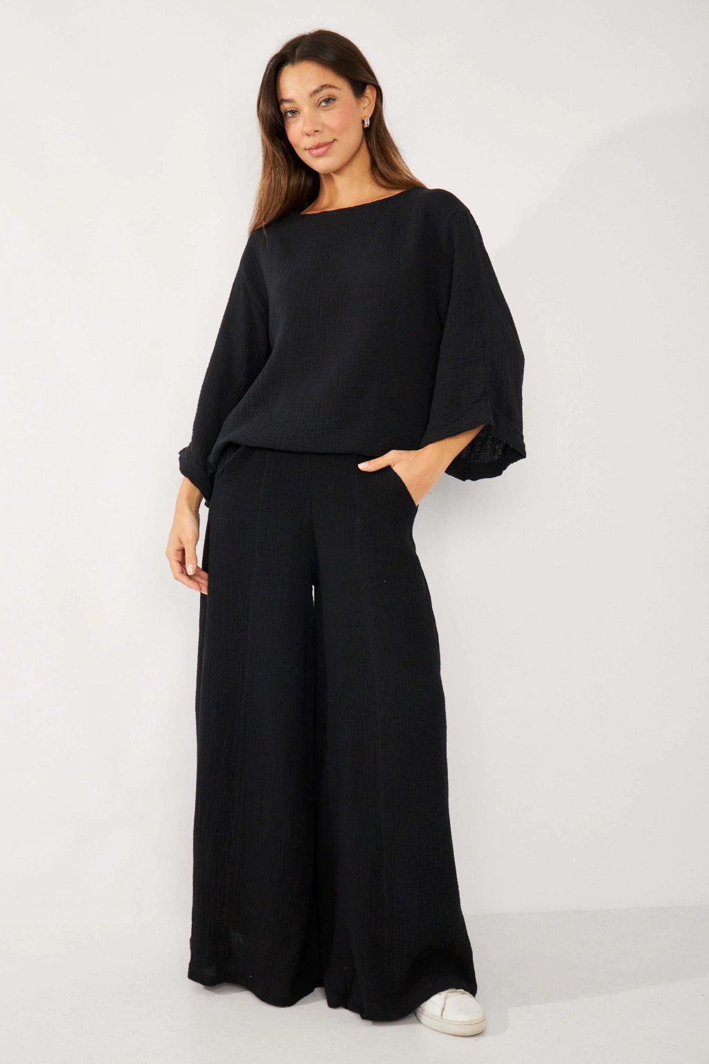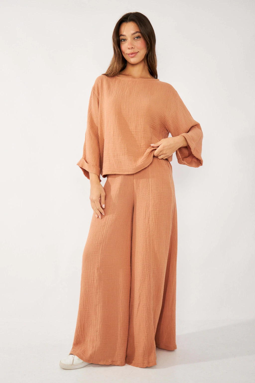 Pantalon confeccionado en baby cotton, modelo ancho con recorte y cintura con elastico