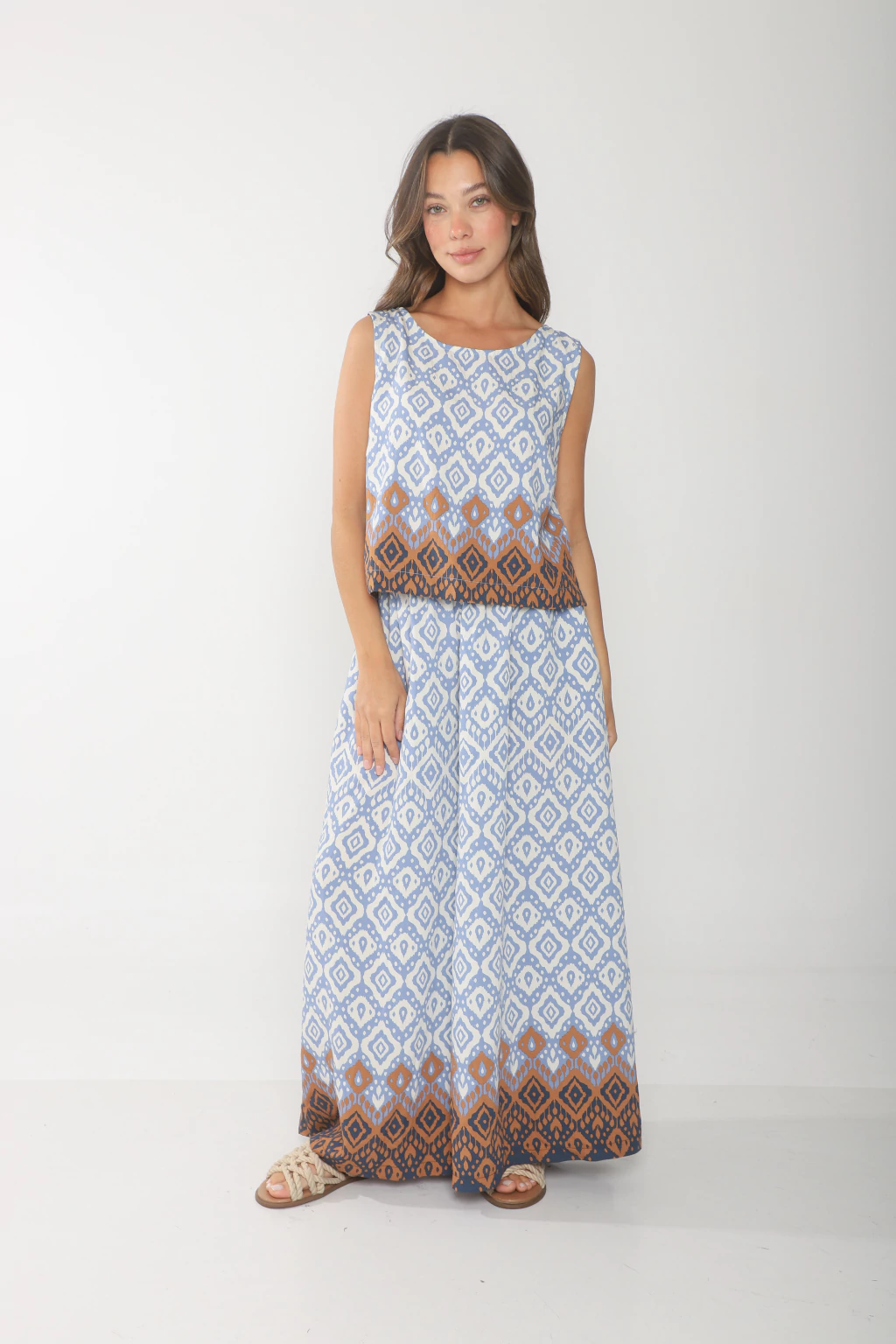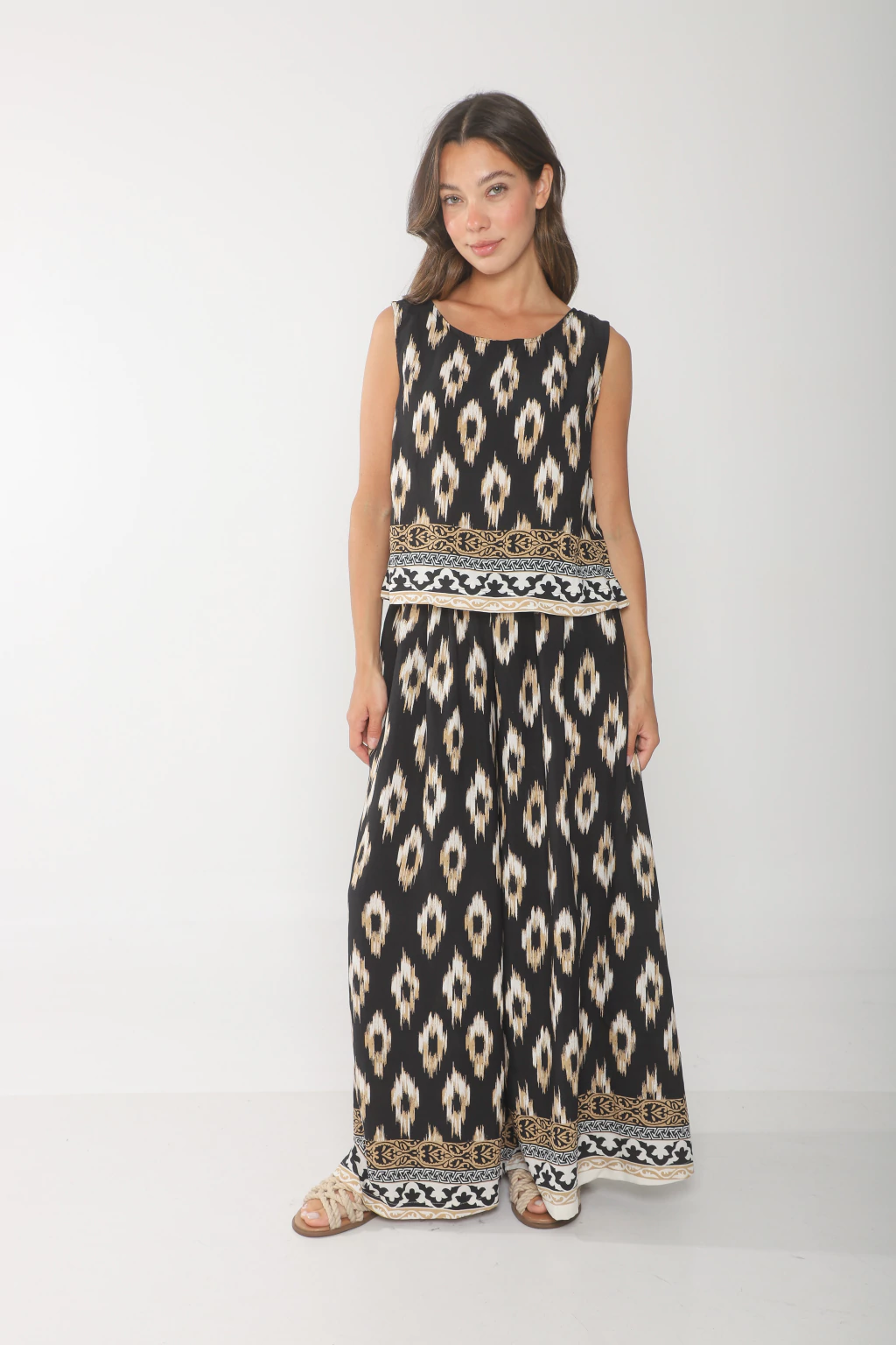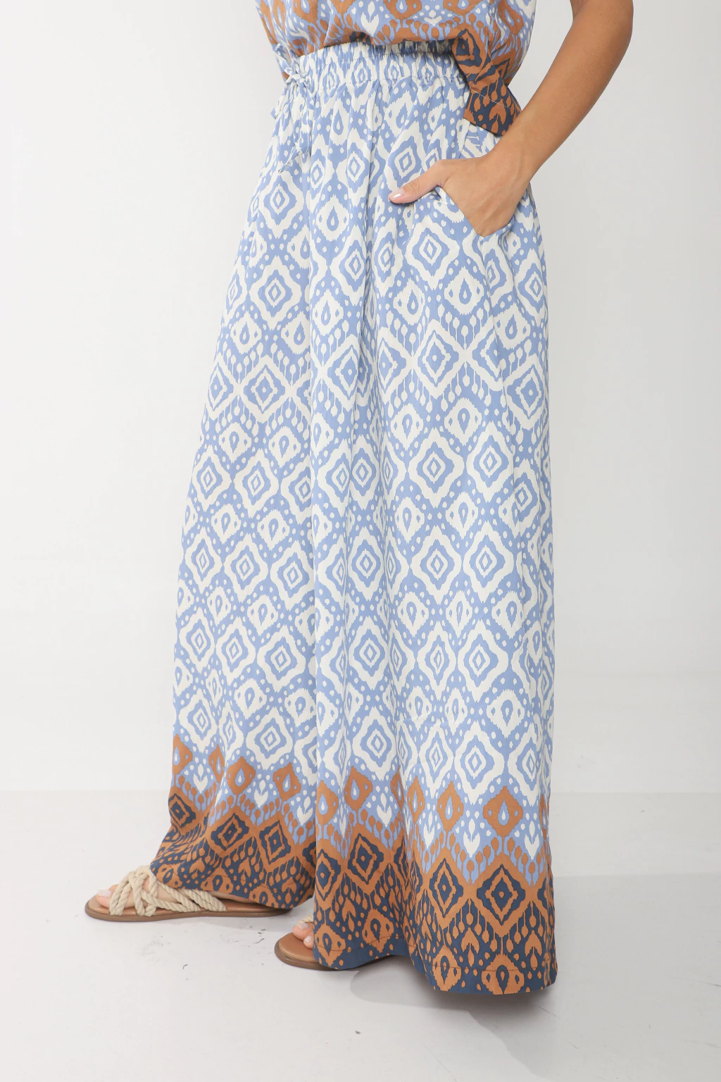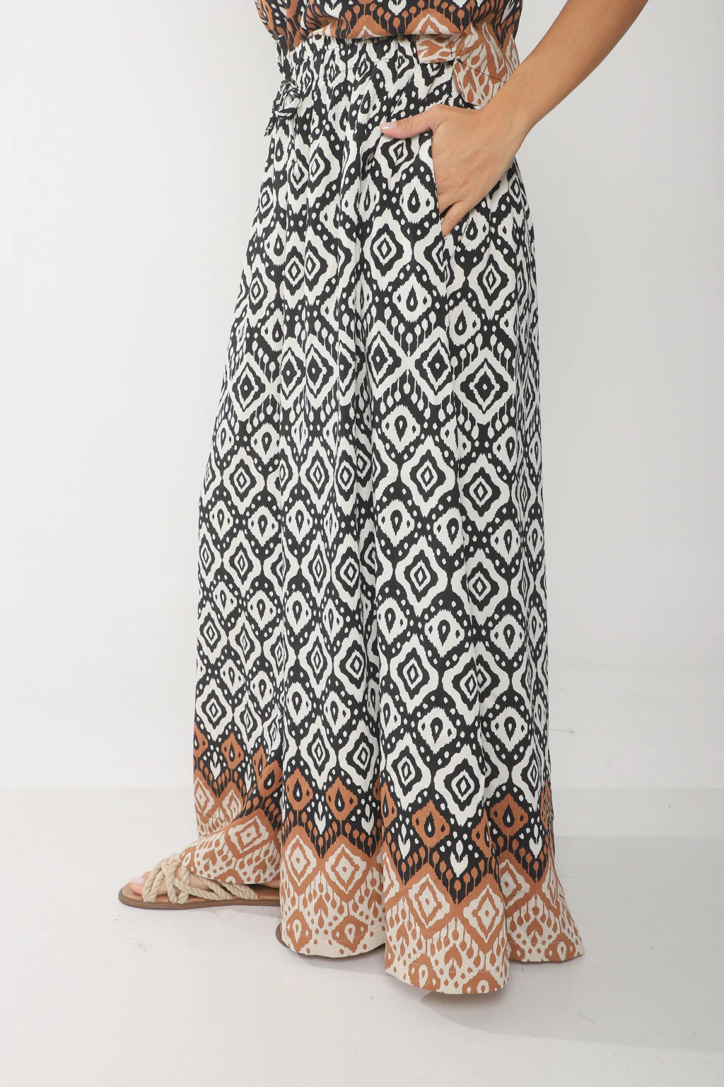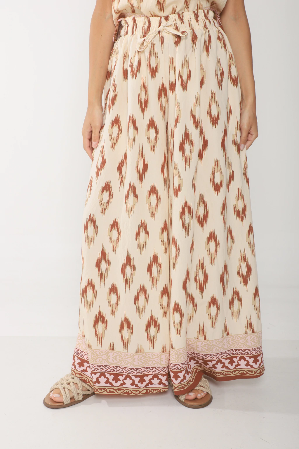 Pantalon confeccionado en seda estampada, modelo amplio con guarda abajo, bolsillo a los costados, elastico en cintura y cordon a tono para atar.