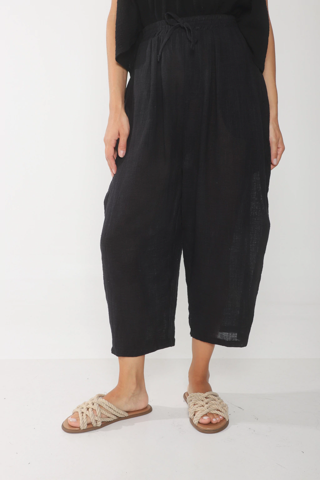 Pantalon confeccionado en bambula, modelo balloon con bolsillos a los costados, cintura con elastico y cordon a tono para atar.