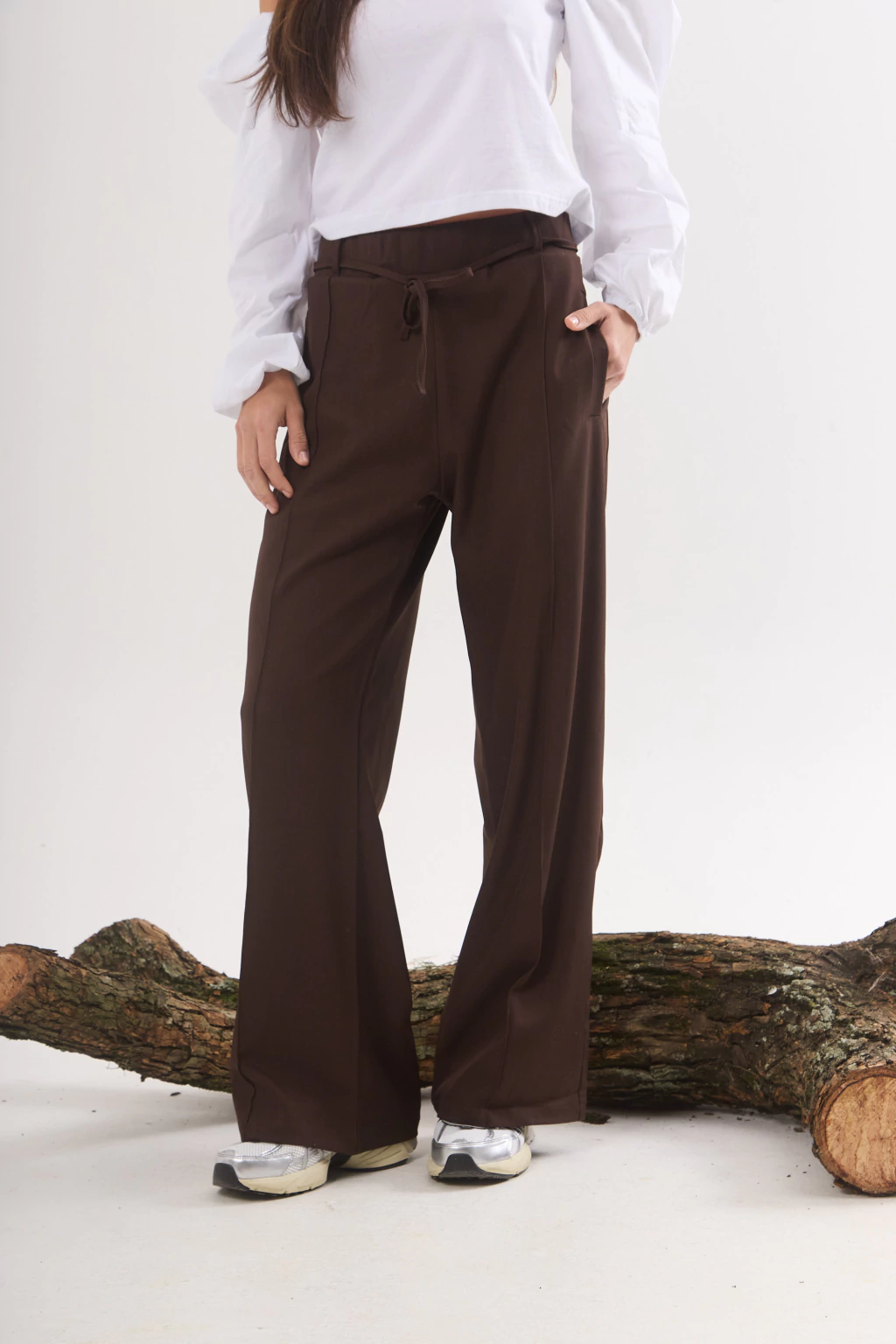 Pantalón confeccionado en tela Sastrera, con alforza central, bolsillo a los costados y cordón a tono.