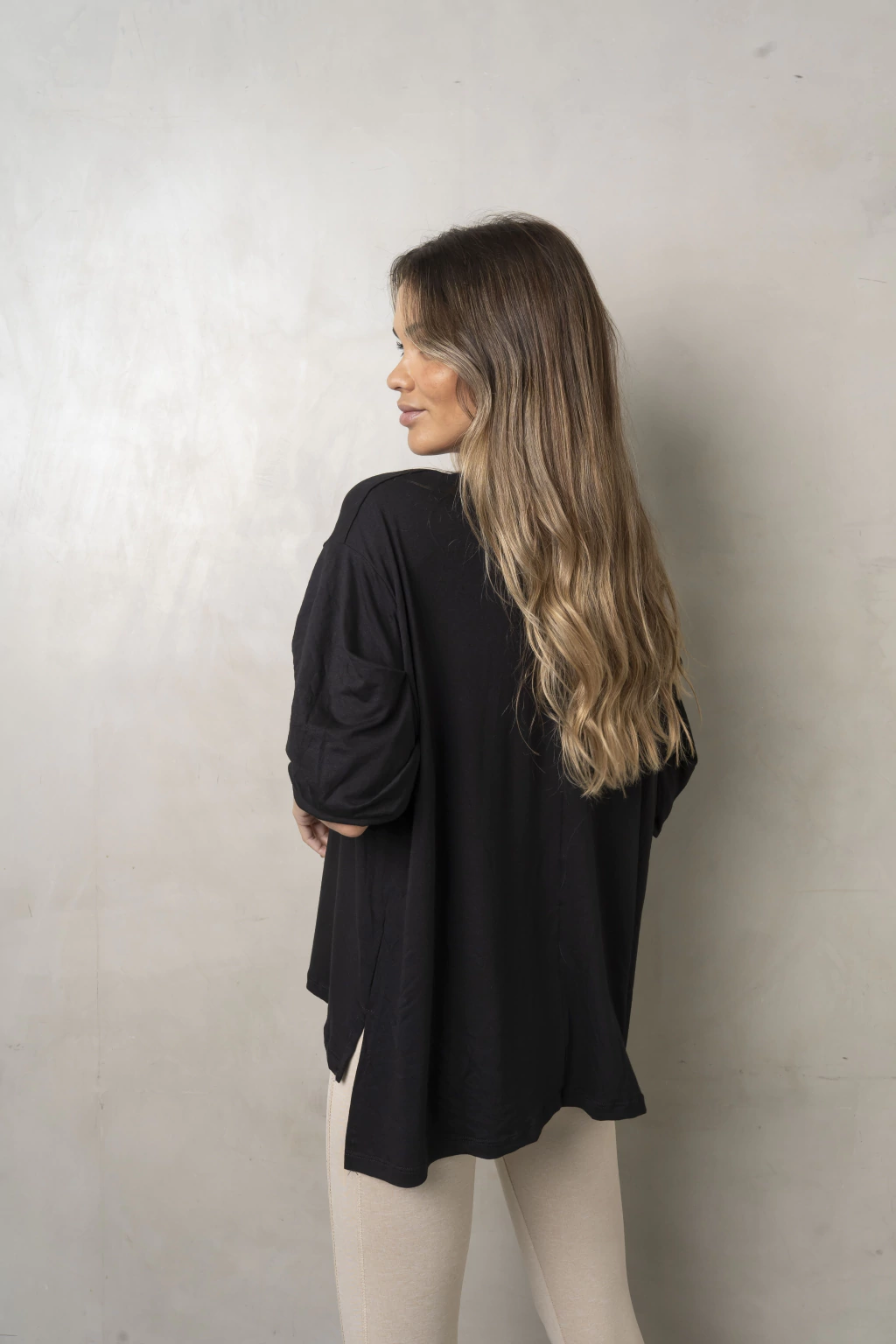 Remeron amplio confeccionado en Crep Viscosa con tajo a los costados.