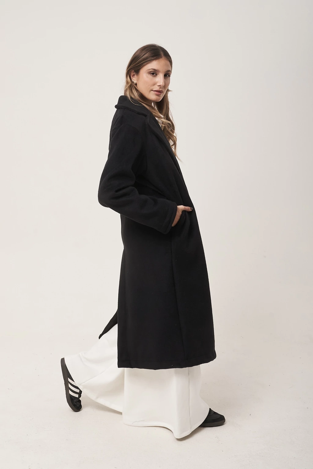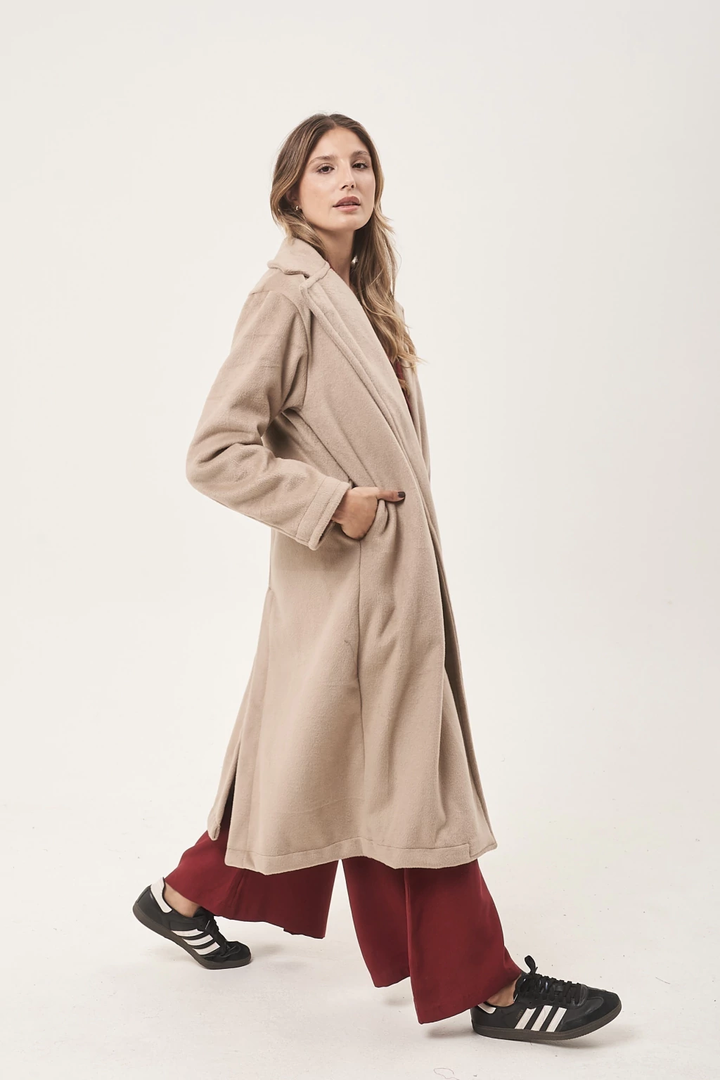 Tapado confeccionado en Paño cashmire, modelo largo entallado con un boton en el centro.