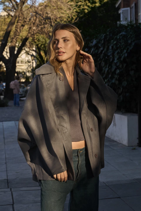 Tapado confeccionado en paño plano, totalmente forrado con tafeta a tono. Son manga muerciélago, bolsillo ojal, suuuuper canchera.