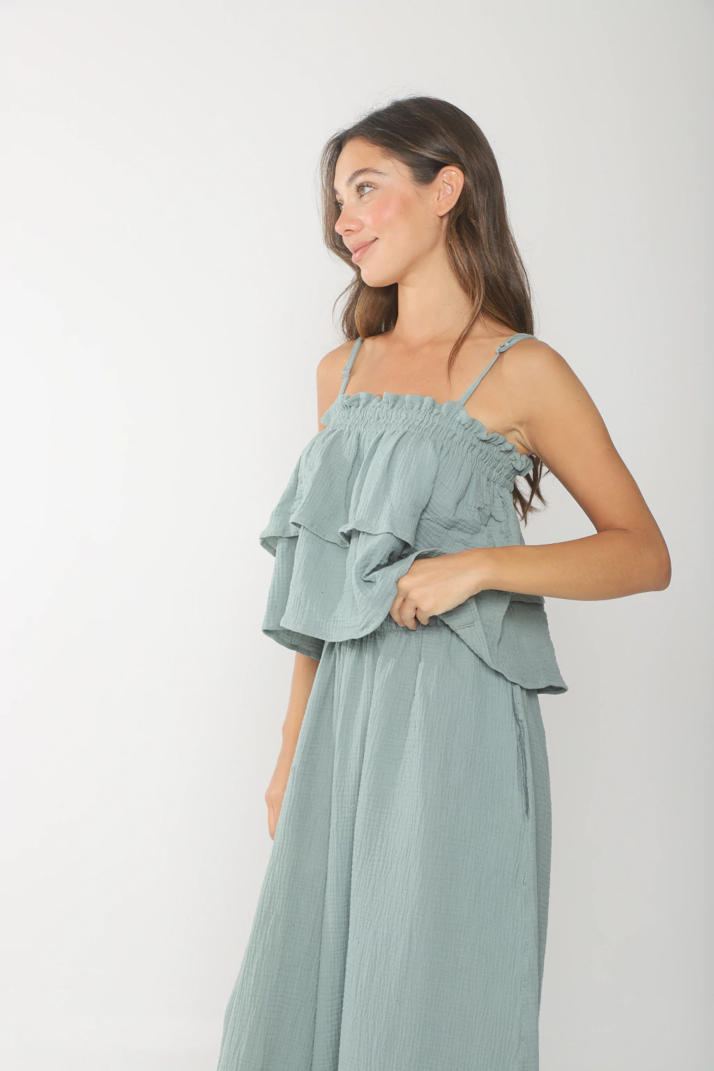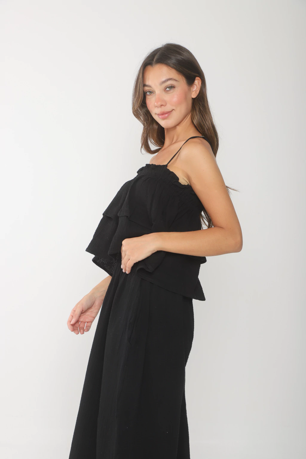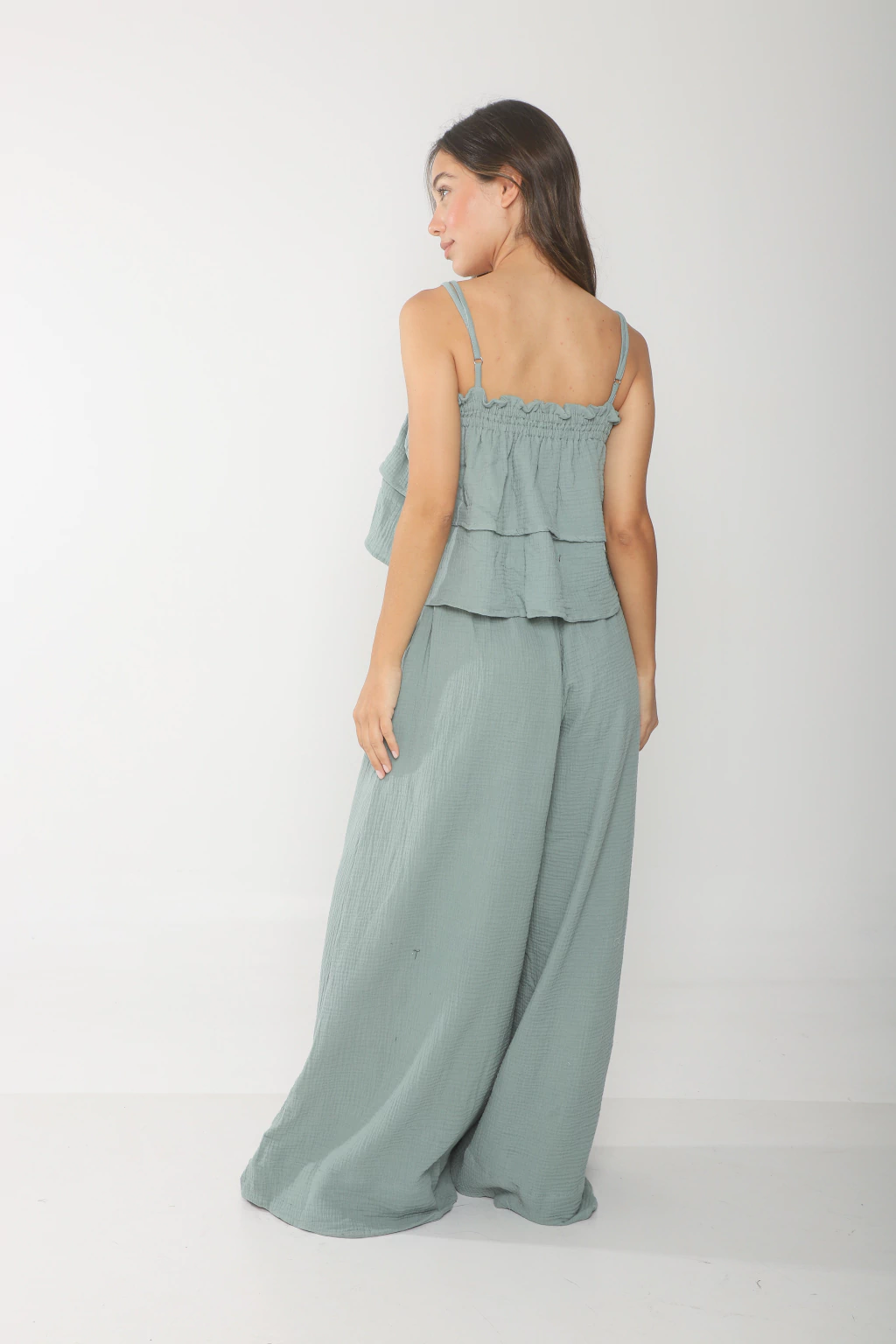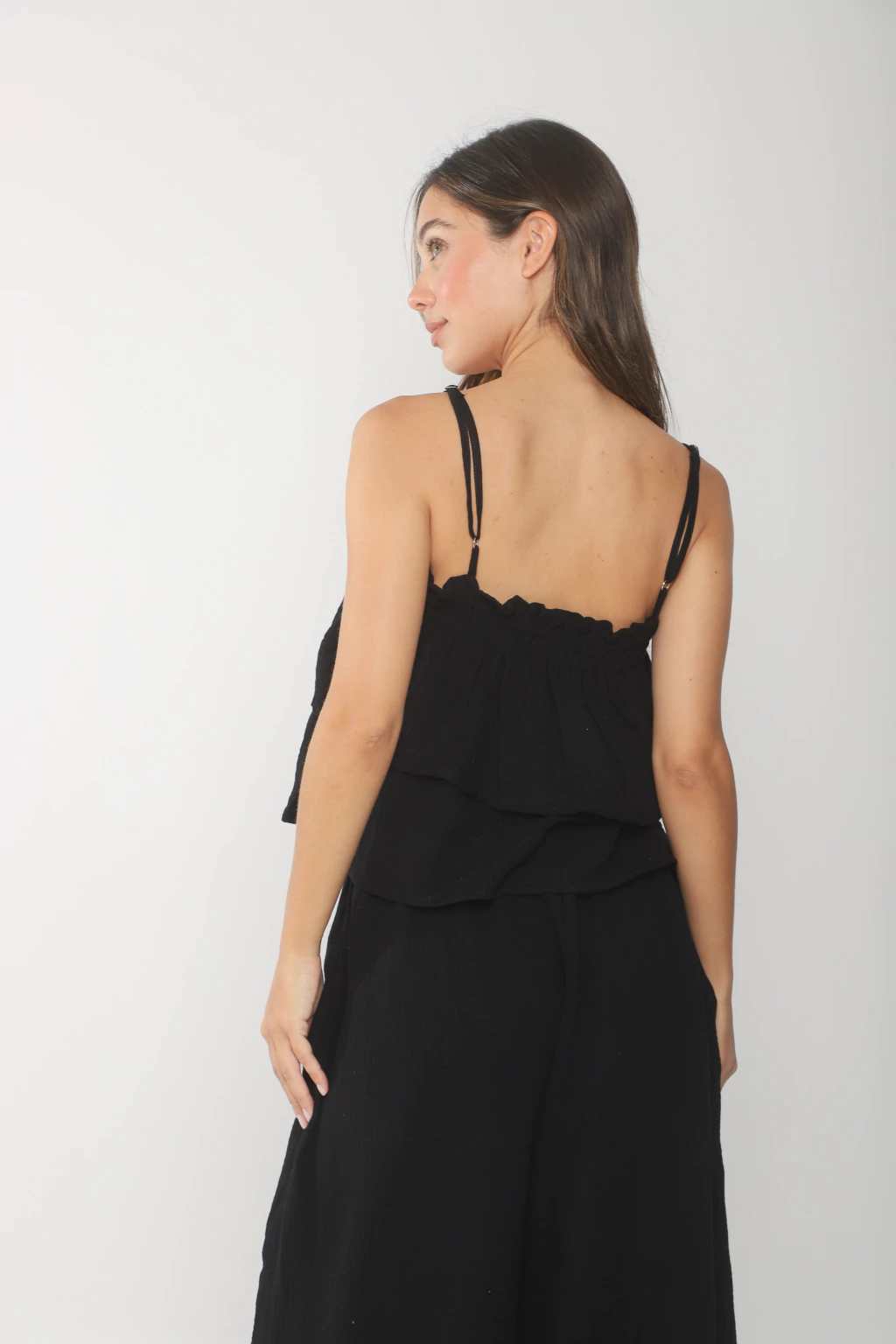 Top confeccionado en baby cotton, modelo con escote recto, doble volado y doble elatico. Tiene breteles para regular