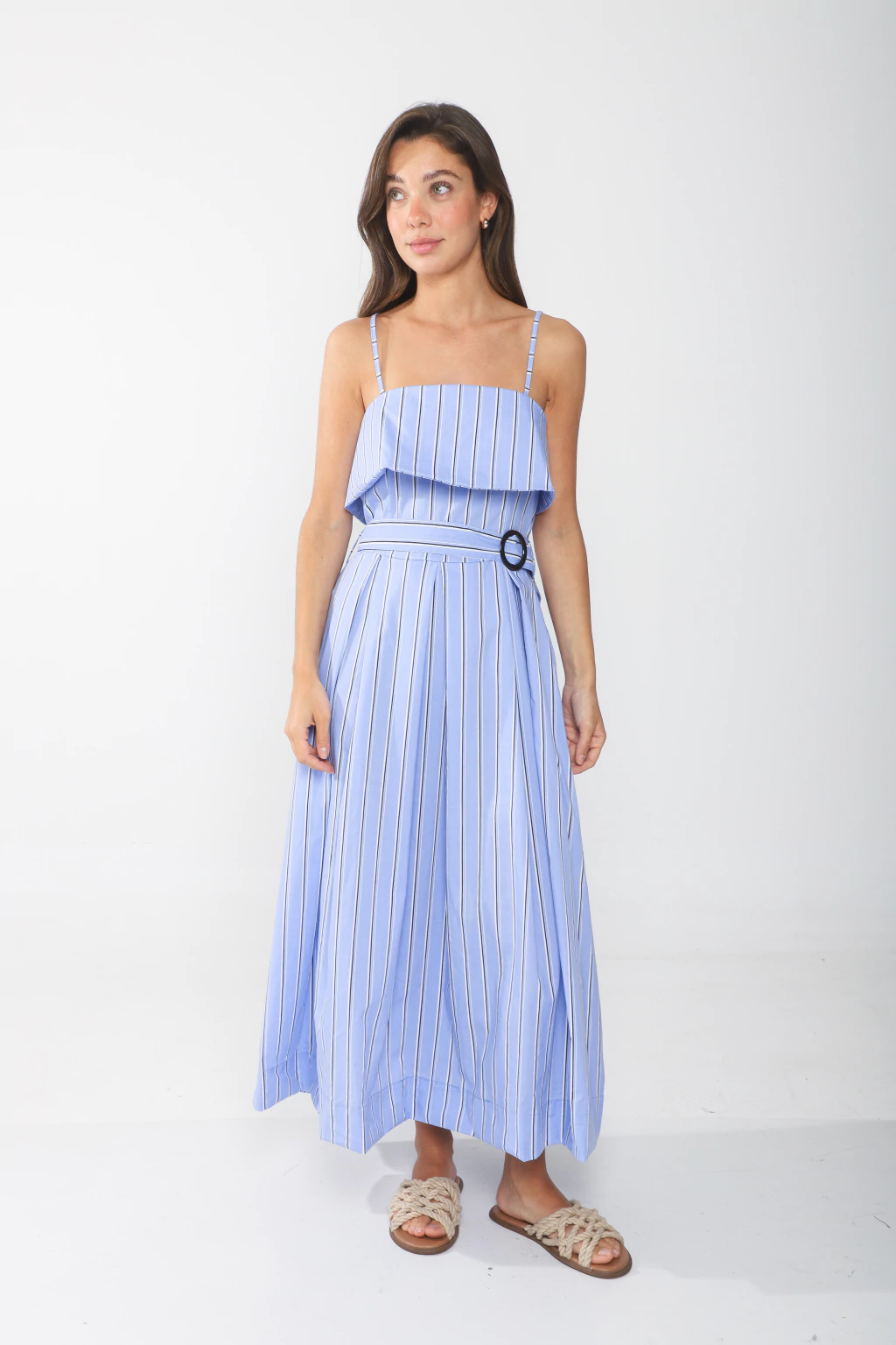 Vestido confeccionado en poplin rayado, modelo con solapa en la parte del busto, entallado en la parte de arriba y evase en la falda, tiene tablas y lazo con hebilla en cintura. Tiene breteles para regular y bolsillos a los costados.